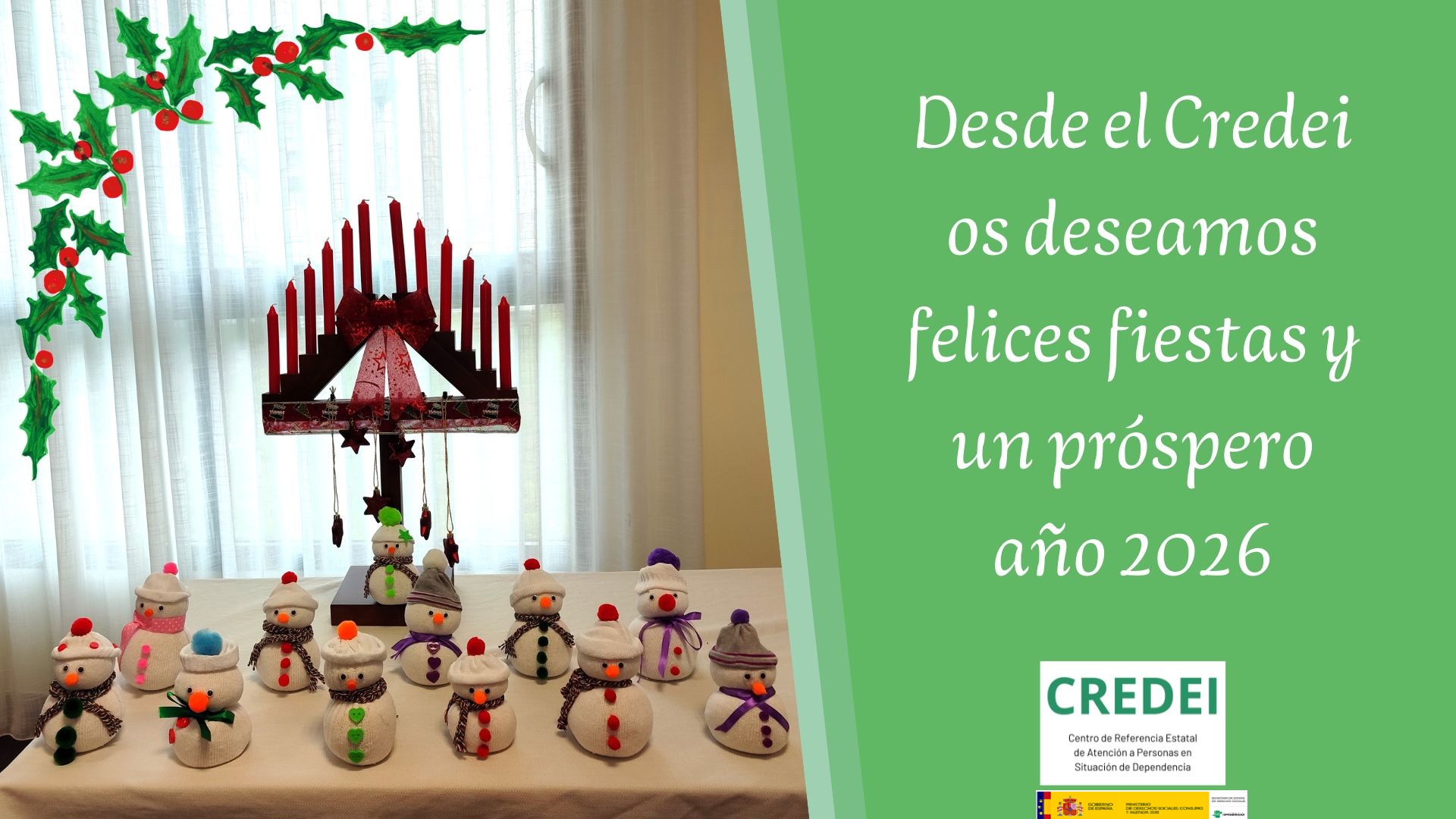 Desde el Centro de Referencia Estatal de Atención a Personas en Situación de Dependencia (Credei) del Imserso en León, de parte de las personas usuarias, familiares y profesionales del centro, os deseamos unas felices fiestas y un próspero año 2026. Nuestra postal navideña quiere reflejar la ilusión de las personas usuarias de Credei decorando un “ramo leonés” (ramu llionés), cuya antigüedad podría remontarse a los pueblos prerromanos, y la confección de los muñecos de nieve con elementos para reciclar.